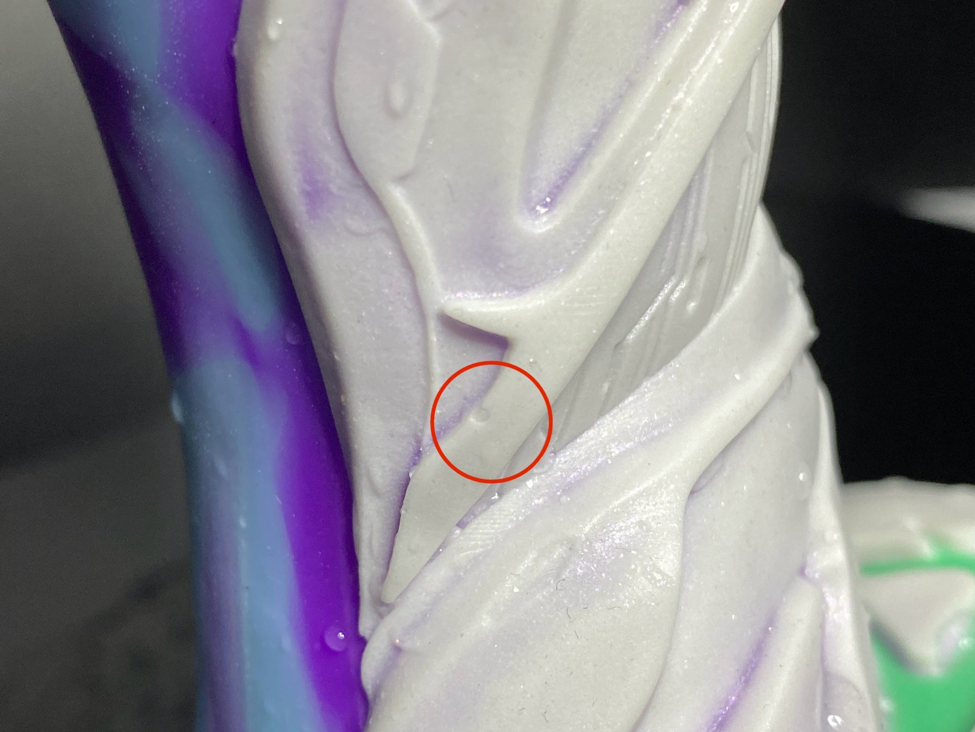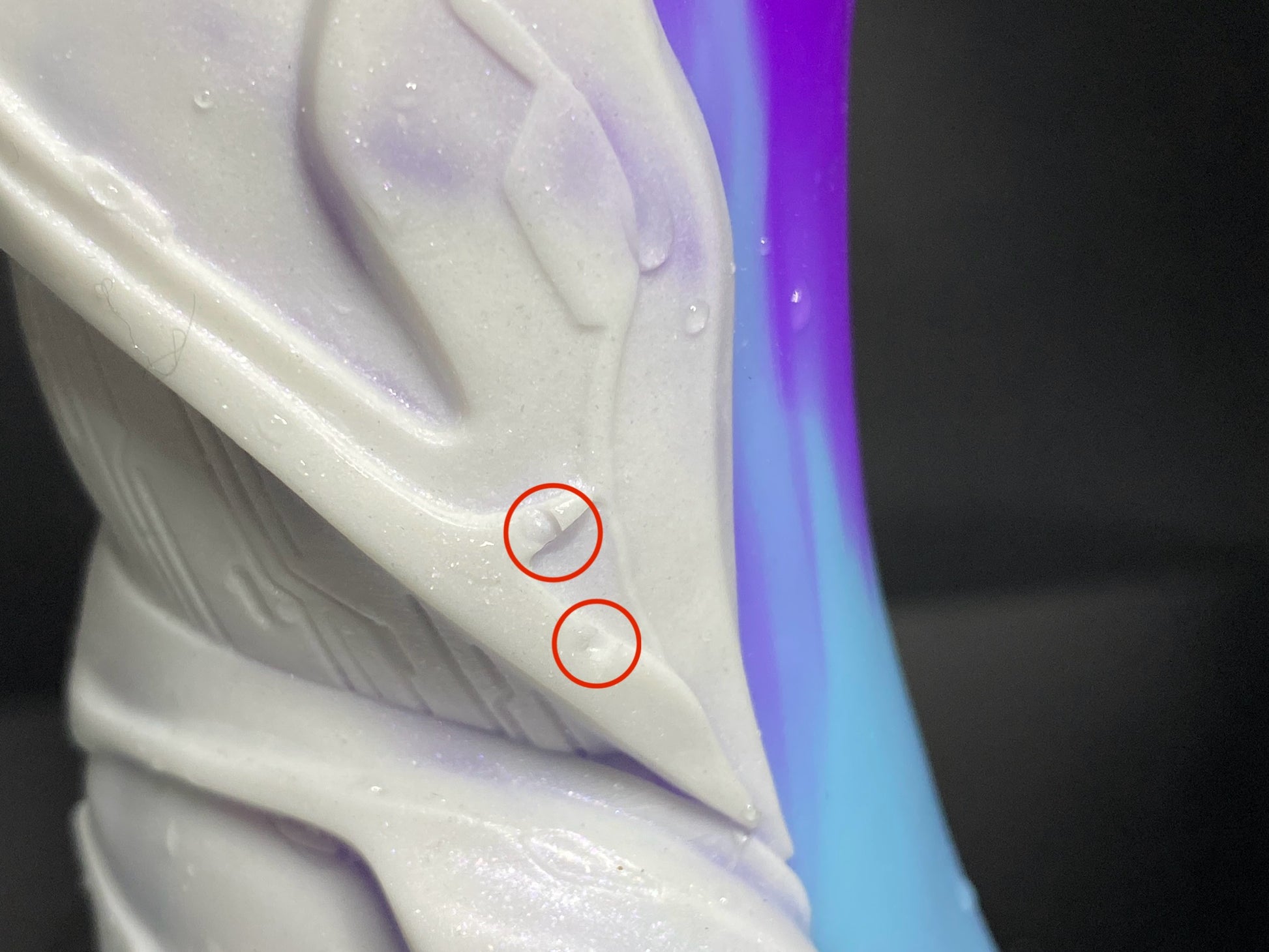 Reason for flop: a few mini bubbles on the surface on the white part of the armour. See circled photos for more info. Smudge of white on the skin part of the model.